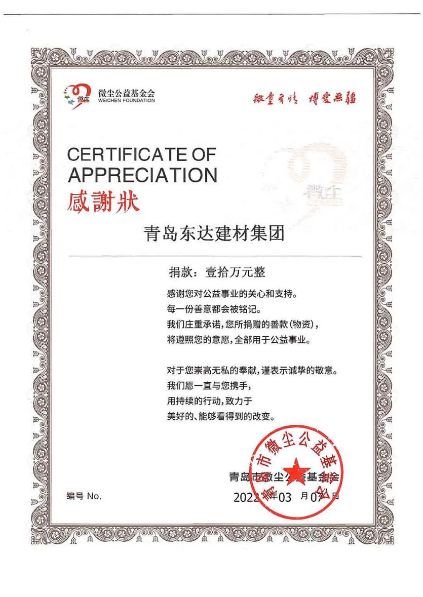2022年3月7日,青島東達(dá)建材集團(tuán)作為微塵公益基金的理事單位,面對萊西突如其來的疫情,關(guān)鍵時(shí)刻伸出援助之手,定向萊西捐款10萬元。