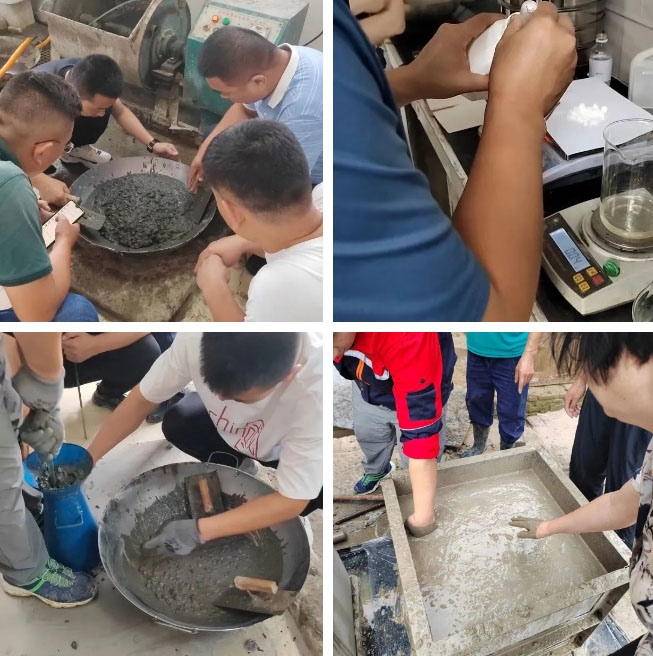 質(zhì)地優(yōu)良的粗骨料玄武巖、高性能的微珠粉、硅灰粉摻合料、直徑0.2毫米鋼纖維……原材料選擇較2021年研發(fā)的C80混凝土標(biāo)準(zhǔn)更高、品控更加精細(xì);一次次試配、優(yōu)化,探索最優(yōu)配合比;一次次攪拌,從180秒、240秒……直到600秒探尋最佳攪拌時長;一次次鋼板擦了再擦進(jìn)行坍落度、擴(kuò)展度測試,尋找坍落度和擴(kuò)展度的最好關(guān)聯(lián);一次次優(yōu)化施工性,直接用手測量浮漿厚度(感知混凝土的和易性)……記錄工作狀態(tài)的一張張照片、一禎禎視頻,文職小編不禁感慨:特固德人是混凝土做的骨肉!
